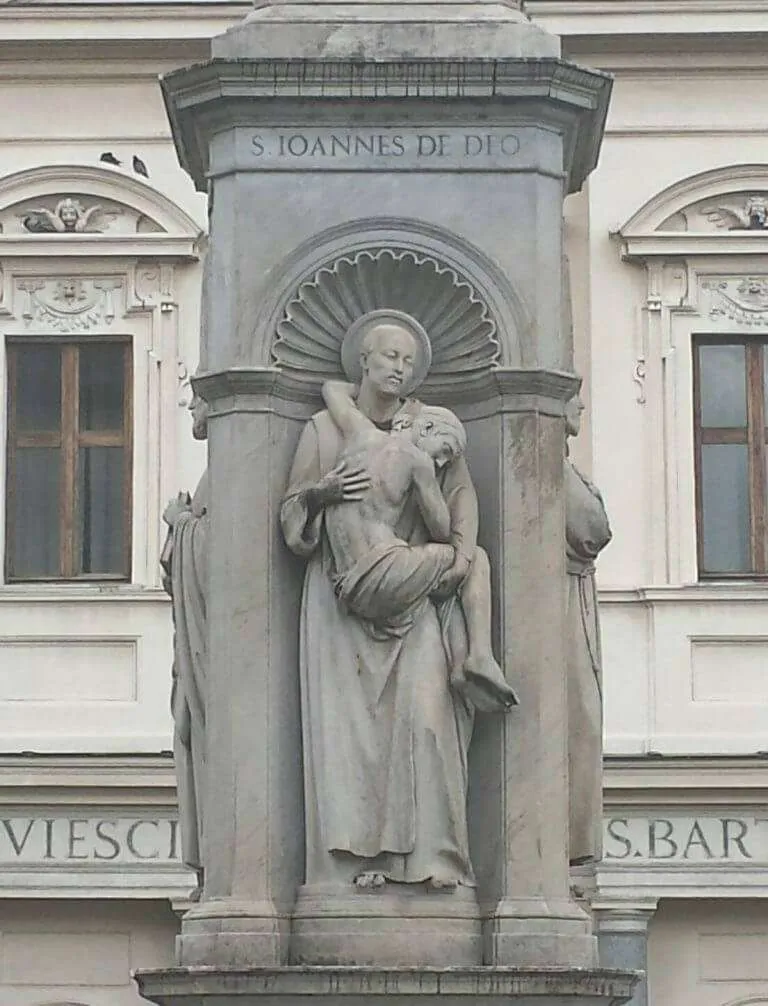 The theory of the day was that those who were insane were best cured by locking them in a dungeon and torturing them continuously until they chose to abandon their insanity, and this is what happened to John. Saint John of Ávila heard of this and began communicating with John, encouraging him, and guiding him. He received every beating in the asylum with joy as penance and offered each sacrificially to God. Throughout, John exhorted the warden and other officers to treat the patients better. When John began to exude a peaceful disposition, the warden was pleased and permitted him to be freed of his shackles. John showed mercy and compassion to others, performing menial charitable tasks and spreading God’s love. He thought to himself, “May Jesus Christ eventually give me the grace to run a hospice where the abandoned poor and those suffering from mental disorders might have refuge and that I may be able to serve them as I wish.”